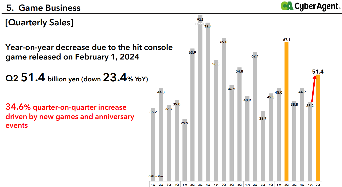 This approach has resulted in a steady stream of revenue (JPY30-40B per quarter) from mobile long-running titles, where the decline in Umamusume and other games has been compensated by revenue from the games done for third parties, although with a much lower margin. That has been accompanied by the occasional non-live-service success (Granblue Fantasy: Relink in Q2 2024).