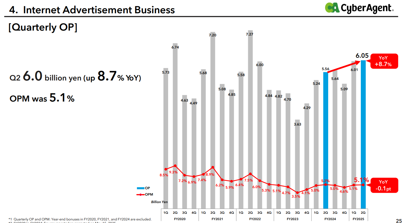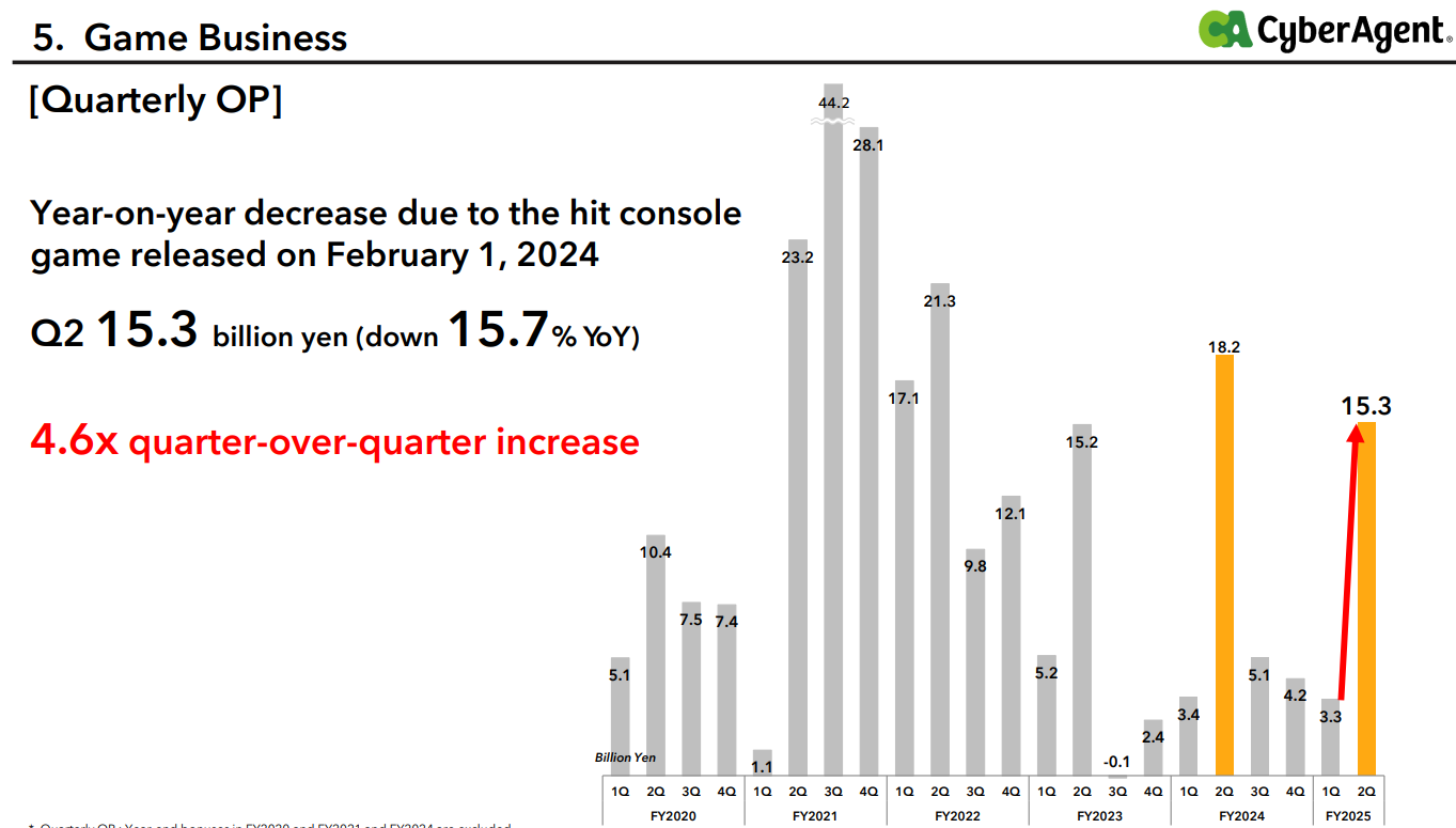 In the last few quarters the results have been slightly better, coinciding with CyberAgent showing some restraint on hiring in the area6 despite increasing volume. If that is just a temporary efficiency effort or signs of the abiity to handle more volume with less people remains to be seen.