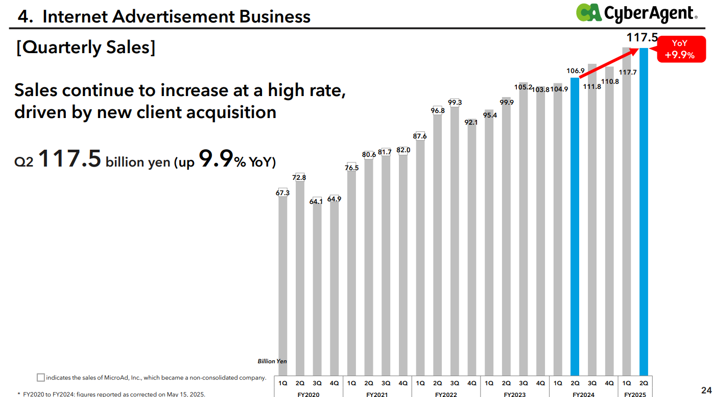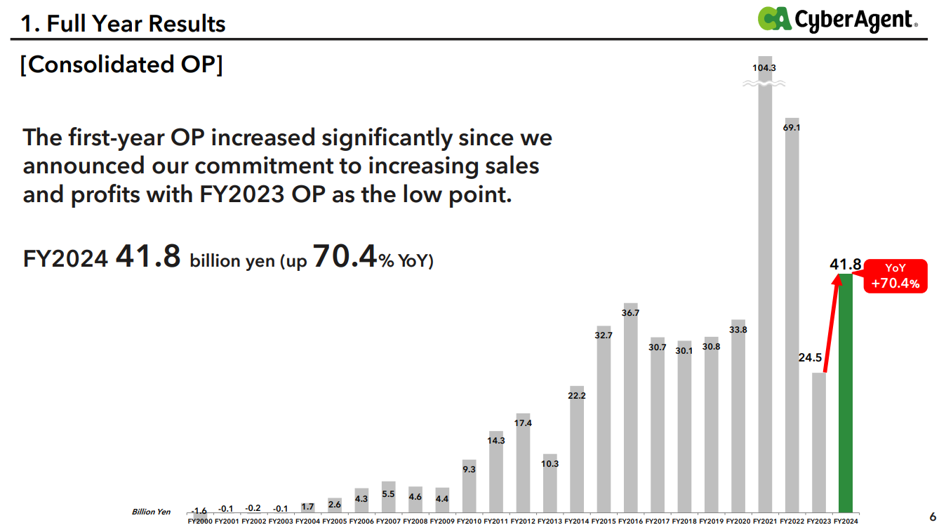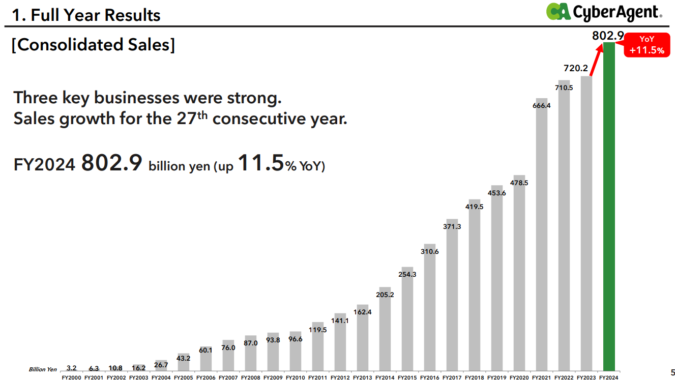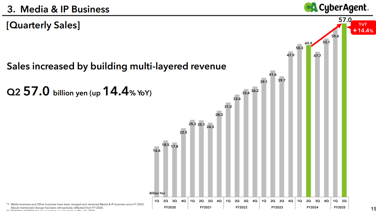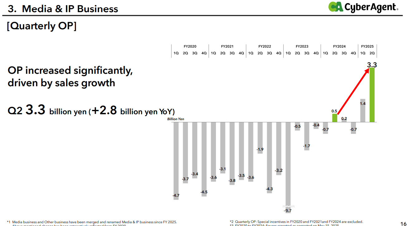 Back in 2016, CyberAgent and TV Asahi9 started a joint venture in streaming, mostly based on an ad-supported model. They have been gaining subscribers and revenue based in conversion to a premium subscription as well, and that is turning profitability as well. From JPY 23B in 2016, the media business grew to 170.8B in 2024, and seems to keep growing (around 12% YoY so far).